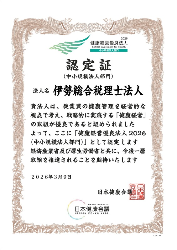 伊勢総合税理士法人は、健康経営優良法人2026に認定されました。認定有効期間は、令和8年3月9日より令和9年3月31日です。