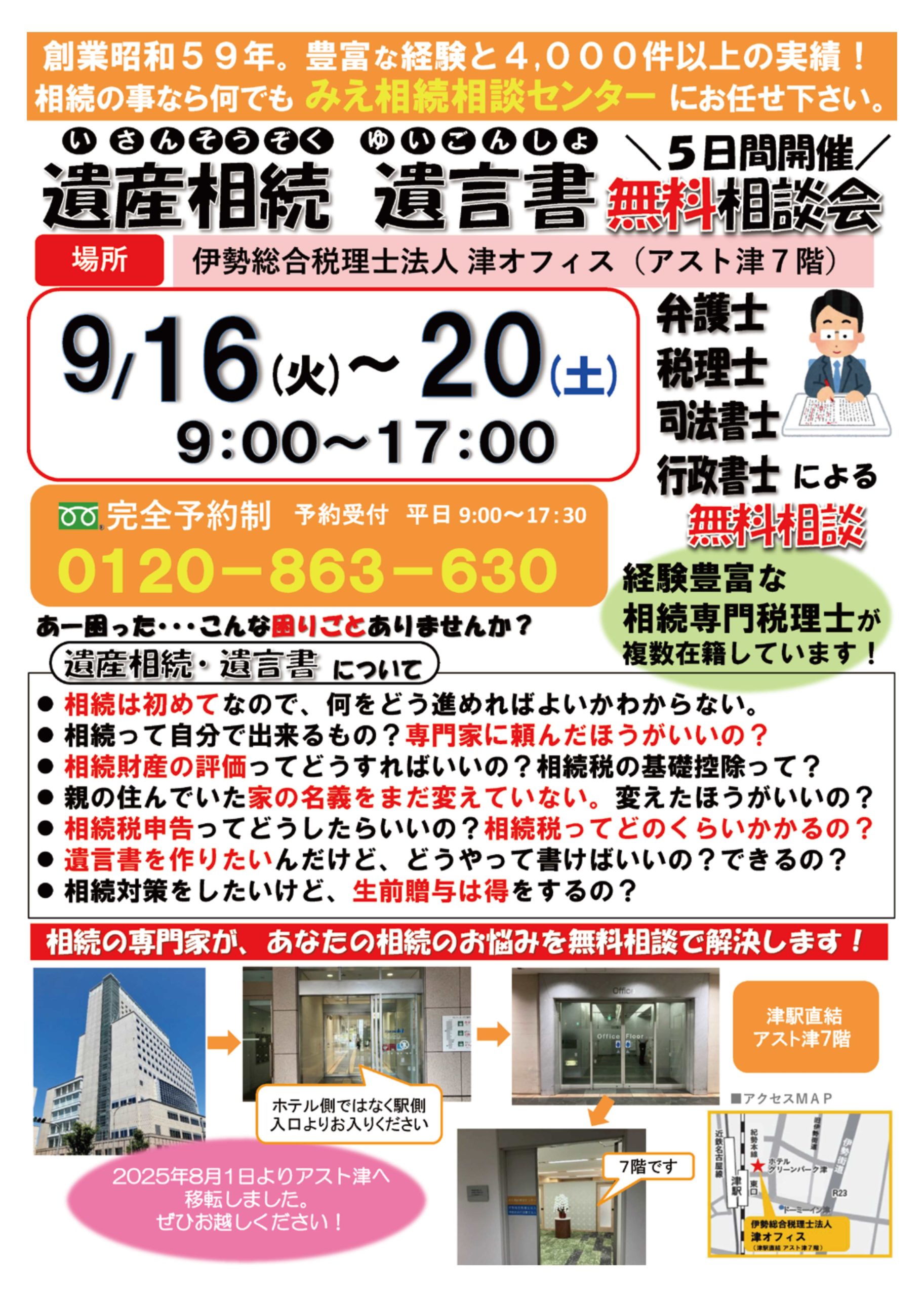 R7年9月16日~20日津オフィス相続無料相談会開催のお知らせ